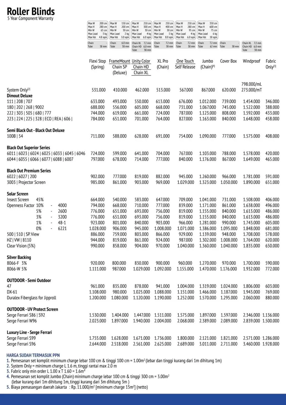 Perlu Anda ketahui bahwa Price List/Daftar harga/Harga khusus/Harga terbaik Roller Blinds Sharp Point kuat hingga lebih dari 10 tahun, Tetapi untuk perawatannya relatif sangat mudah. Asalkan sisa barang Anda simpan, dengan sisa barang itu kerusakan akan dapat diperbaiki dengan mudah. Jangan ragu ragu lagi, segera percantik ruangan Anda karena kami punya beragam model produk untuk Anda pasang di Rumah atau Kantor Anda.