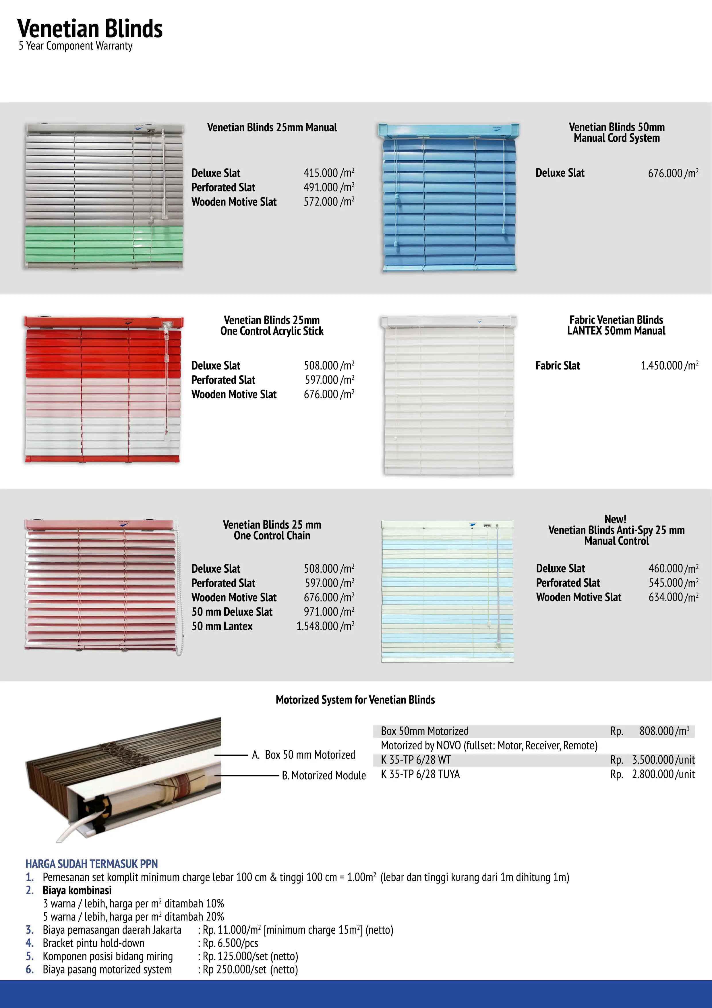 Perlu Anda ketahui bahwa Price List/Daftar harga/Harga khusus/Harga terbaik Venetian Blinds Sharp Point kuat hingga lebih dari 10 tahun, Tetapi untuk perawatannya relatif sangat mudah. Asalkan sisa barang Anda simpan, dengan sisa barang itu kerusakan akan dapat diperbaiki dengan mudah. Jangan ragu ragu lagi, segera percantik ruangan Anda karena kami punya beragam model produk untuk Anda pasang di Rumah atau Kantor Anda.